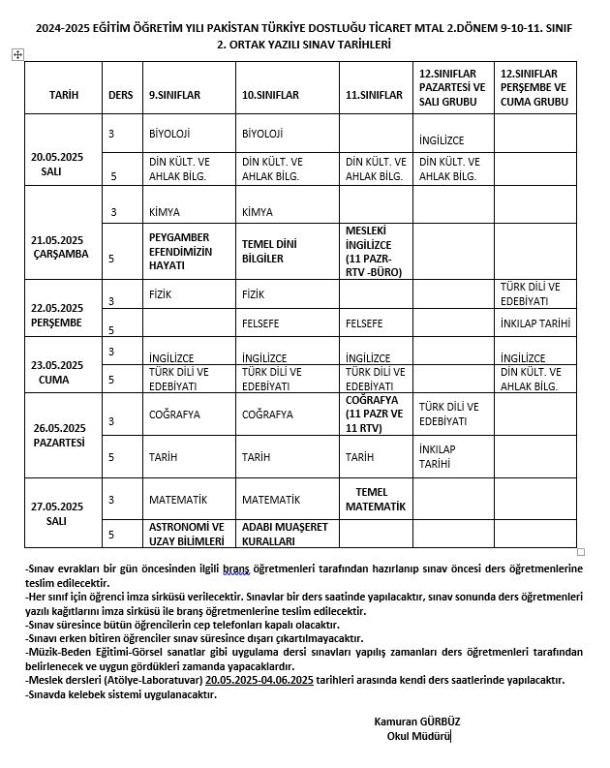 Okulumuz örgün eğitim öğrencileri için 2.dönem 2.sınav tarihleri açıklandı. Meslek sınavları, alan öğretmenlerinin açıklayacağı tarihlerde yapılacaktır.