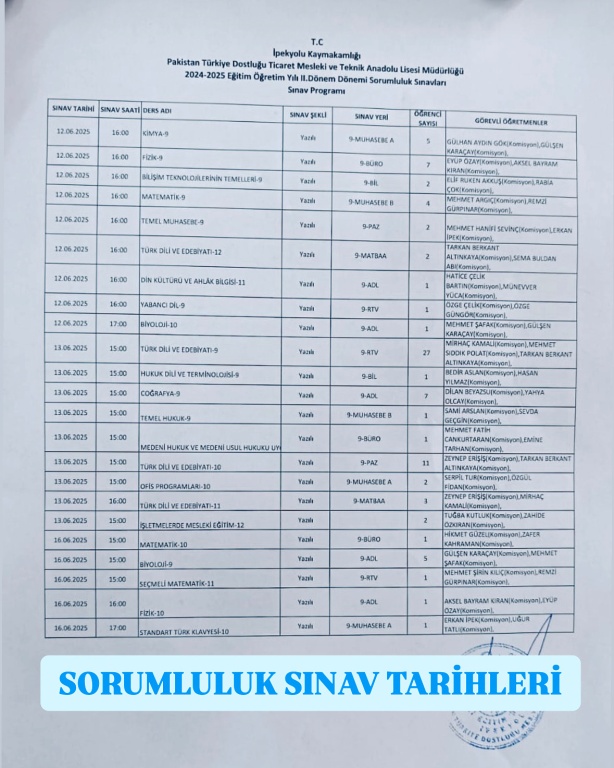 2024-2025 Eğitim Öğretim Yılı Haziran Ayı Sorumluluk Sınav Tarihleri açıklandı.
